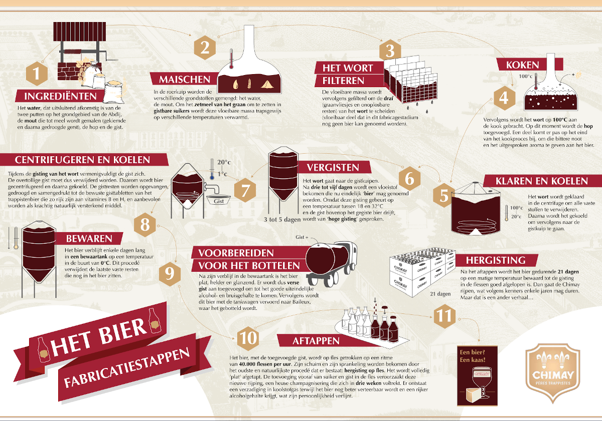 Hieronder een infographic hoe het trappistenbier van Chimay wordt gebrouwen. Klik voor een grotere weergave.