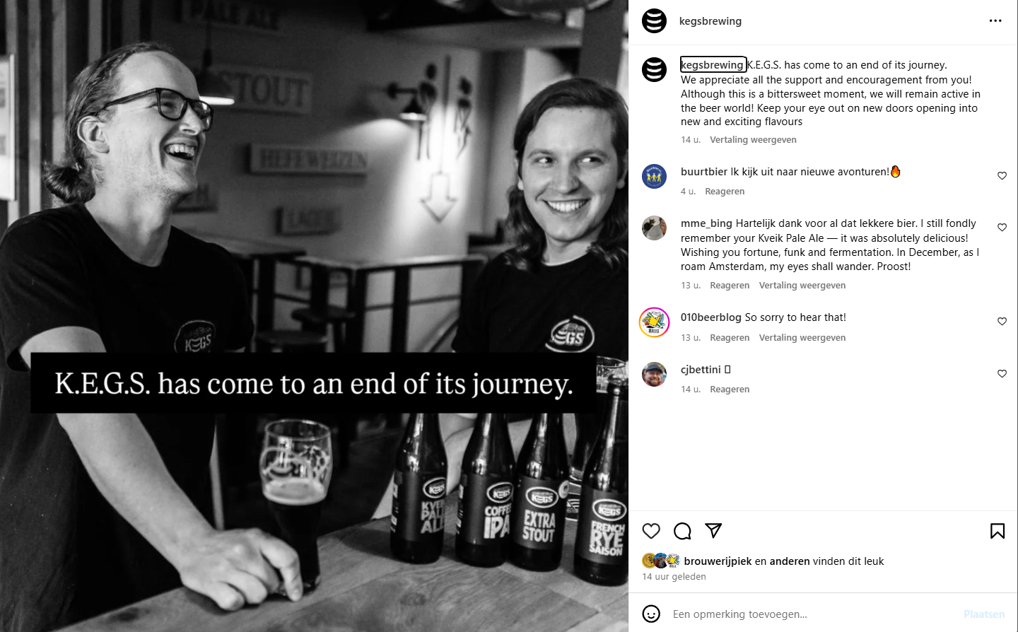 Op 7 april 2025 plaatste de brouwerij onderstaande post op social media. De vertaling is: K.E.G.S. heeft het einde van zijn reis bereikt. Na een periode vol creativiteit en bijzondere bieren komt er een punt achter het project. De brouwers hebben veel waardering voor de steun en betrokkenheid van liefhebbers en volgers. Hoewel dit een afscheid is, blijven de mannen actief in de bierwereld. Er wordt al vooruitgeblikt op nieuwe initiatieven en smaakvolle ontdekkingen.