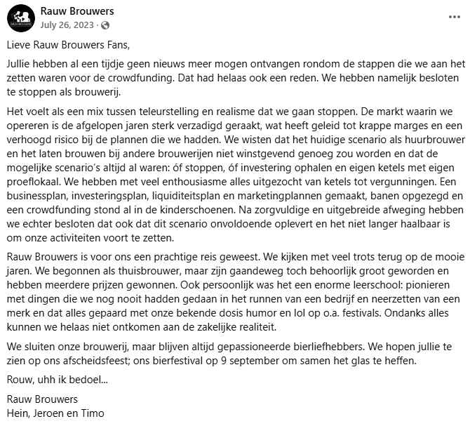 Op 26-07-2023 plaatste de brouwerij een bericht op Facebook dat zij besloten te stoppen met de brouwerij.