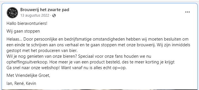 Medio 2022 is besloten om te stoppen met de brouwerij. Mede-oprichter Ian over deze beslissing in september 2022: "Wij gaan stoppen. Door persoonlijke (ik word binnenkort vader) en bedrijfsmatige omstandigheden (oplopende grondstofprijzen) hebben wij moeten besluiten om te gaan stoppen met onze brouwerij. Wij zijn inmiddels gestopt met het produceren van bier (onze installatie is verkocht)."