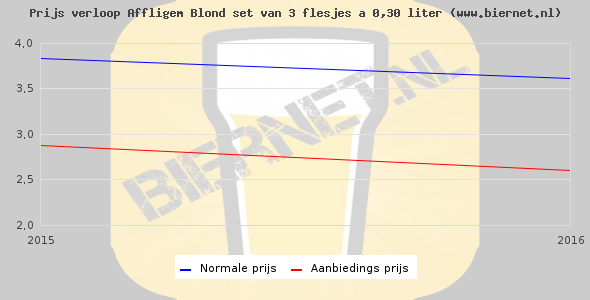 De gemiddelde prijs van een set van 3 flesjes á 0,30 liter van Affligem Blond is niet bekend. De gemiddelde prijs van Affligem Blond in de winkel is niet bekend.