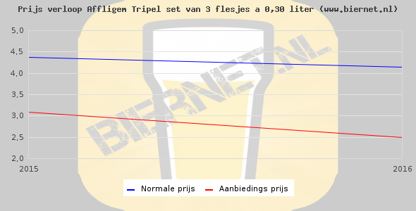 De gemiddelde prijs van een set van 3 flesjes á 0,30 liter van Affligem Tripel is niet bekend. De gemiddelde prijs van Affligem Tripel in de winkel is niet bekend.