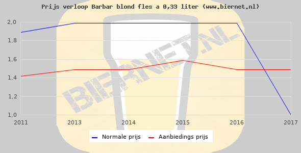 De gemiddelde prijs van een fles á 0,33 liter van Barbar blond is €2,61 (€7,91 per liter). De gemiddelde prijs van Barbar blond in de winkel is €8,53 per liter.