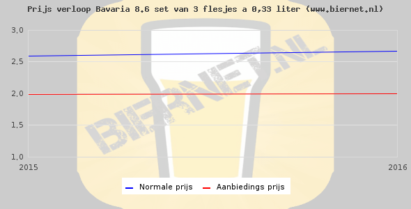 De gemiddelde prijs van een set van 3 flesjes á 0,33 liter van Bavaria 8.6 Original is niet bekend. De gemiddelde prijs van Bavaria 8.6 Original in de winkel is niet bekend.