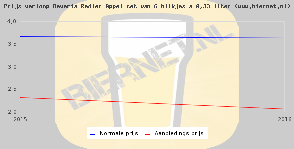 De gemiddelde prijs van een set van 6 blikjes 0,33 liter van Bavaria Radler Appel is niet bekend. De gemiddelde prijs van Bavaria Radler Appel in de winkel is niet bekend.