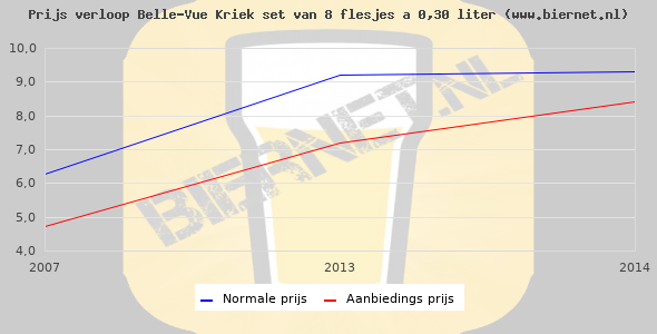 De gemiddelde prijs van een set van 8 flesjes á 0,30 liter van Belle-Vue Kriek is niet bekend. De gemiddelde prijs van Belle-Vue Kriek in de winkel is niet bekend.
