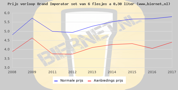 De gemiddelde prijs van een set van 6 flesjes á 0,30 liter van Brand Imperator is niet bekend. De gemiddelde prijs van Brand Imperator in de winkel is niet bekend.