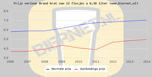 De gemiddelde prijs van een krat van 12 flesjes á 0,30 liter van Brand Pilsener is niet bekend. De gemiddelde prijs van Brand Pilsener in de winkel is niet bekend.