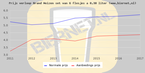 De gemiddelde prijs van een set van 6 flesjes á 0,30 liter van Brand Weizen is €7,41 (€4,12 per liter). De gemiddelde prijs van Brand Weizen in de winkel is €4,13 per liter.