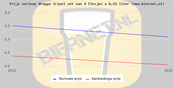 De gemiddelde prijs van een set van 4 flesjes á 0,33 liter van Brugge Tripel is niet bekend. De gemiddelde prijs van Brugge Tripel in de winkel is niet bekend.