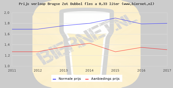De gemiddelde prijs van een fles á 0,33 liter van Brugse Zot Dubbel is €2,45 (€7,42 per liter). De gemiddelde prijs van Brugse Zot Dubbel in de winkel is €7,18 per liter.
