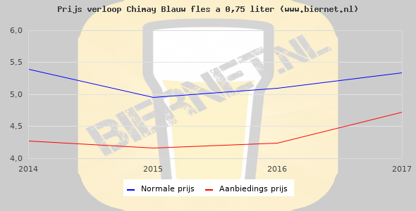 De gemiddelde prijs van een fles á 0,75 liter van Chimay Blauw is €7,63 (€10,17 per liter). De gemiddelde prijs van Chimay Blauw in de winkel is €9,17 per liter.