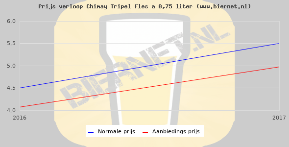 De gemiddelde prijs van een fles á 0,75 liter van Chimay Tripel is €7,08 (€9,44 per liter). De gemiddelde prijs van Chimay Tripel in de winkel is €7,93 per liter.