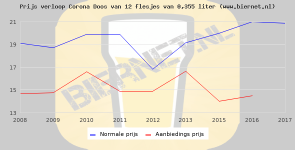 De gemiddelde prijs van een doos van 12 flesjes van 0,355 liter van Corona is niet bekend. De gemiddelde prijs van Corona in de winkel is niet bekend.