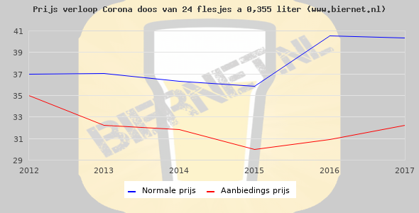 De gemiddelde prijs van een doos van 24 flesjes á 0,355 liter van Corona is €7,5 (€0,88 per liter). De gemiddelde prijs van Corona in de winkel is €4,54 per liter.