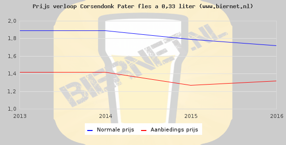 De gemiddelde prijs van een fles á 0,33 liter van Corsendonk Pater is €2,45 (€7,42 per liter). De gemiddelde prijs van Corsendonk Pater in de winkel is €7,42 per liter.