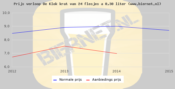 De gemiddelde prijs van een krat van 24 flesjes á 0,30 liter van De Klok Pilsner is €11,36 (€1,58 per liter). De gemiddelde prijs van De Klok Pilsner in de winkel is €2,14 per liter.