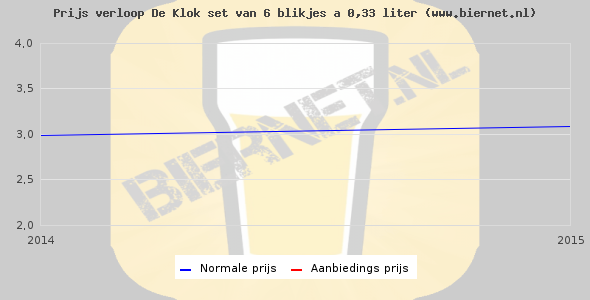 De gemiddelde prijs van een set van 6 blikjes 0,33 liter van De Klok Pilsner is €3,97 (€2,01 per liter). De gemiddelde prijs van De Klok Pilsner in de winkel is €2,14 per liter.