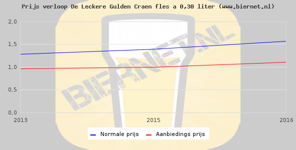 De gemiddelde prijs van een fles á 0,30 liter van De Leckere Gulden Craen is niet bekend. De gemiddelde prijs van De Leckere Gulden Craen in de winkel is niet bekend.