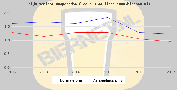 De gemiddelde prijs van een fles á 0,33 liter van Desperados Original is €1,78 (€5,39 per liter). De gemiddelde prijs van Desperados Original in de winkel is €4,64 per liter.