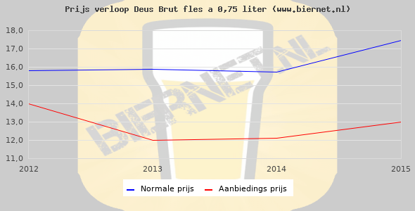 De gemiddelde prijs van een fles á 0,75 liter van DeuS Brut des Flandres is €23,73 (€31,64 per liter). De gemiddelde prijs van DeuS Brut des Flandres in de winkel is €30,07 per liter.