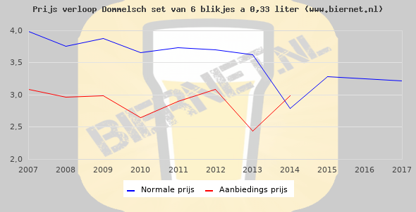 De gemiddelde prijs van een set van 6 blikjes 0,33 liter van Dommelsch Pilsener is €5,99 (€3,03 per liter). De gemiddelde prijs van Dommelsch Pilsener in de winkel is €2,48 per liter.