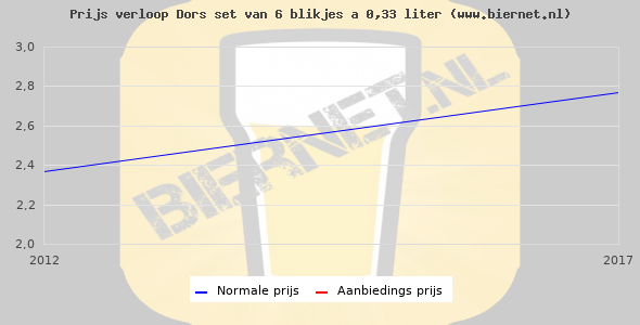 De gemiddelde prijs van een set van 6 blikjes 0,33 liter van Dors Premium Pilsener is €2,66 (€1,34 per liter). De gemiddelde prijs van Dors Premium Pilsener in de winkel is €1,21 per liter.