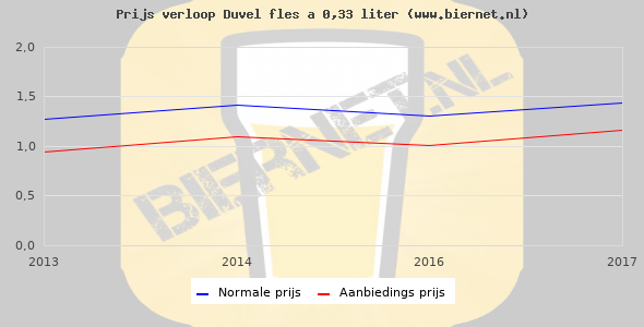 De gemiddelde prijs van een fles á 0,33 liter van Duvel is €2,26 (€6,85 per liter). De gemiddelde prijs van Duvel in de winkel is €6,68 per liter.