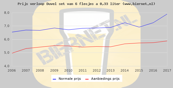 De gemiddelde prijs van een set van 6 flesjes á 0,33 liter van Duvel is niet bekend. De gemiddelde prijs van Duvel in de winkel is niet bekend.