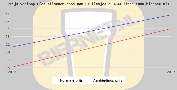 De gemiddelde prijs van een doos van 24 flesjes á 0,33 liter van Efes pilsener is niet bekend. De gemiddelde prijs van Efes pilsener in de winkel is niet bekend.