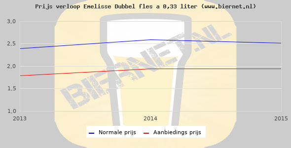 De gemiddelde prijs van een fles á 0,33 liter van Emelisse Dubbel is niet bekend. De gemiddelde prijs van Emelisse Dubbel in de winkel is niet bekend.