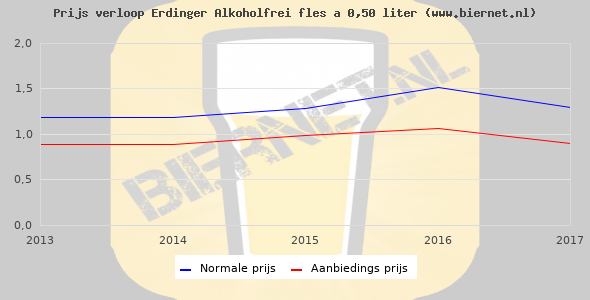 De gemiddelde prijs van een fles á 0,50 liter van Erdinger Alkoholfrei is €1,9 (€3,8 per liter). De gemiddelde prijs van Erdinger Alkoholfrei in de winkel is €4,08 per liter.