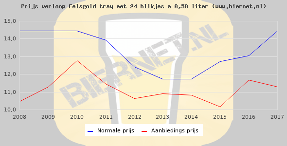 De gemiddelde prijs van een tray met 24 blikjes 0,50 liter van Felsgold is niet bekend. De gemiddelde prijs van Felsgold in de winkel is niet bekend.