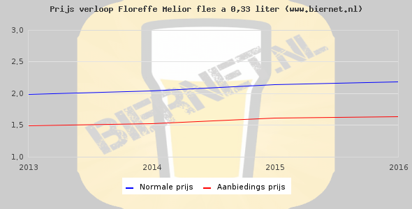 De gemiddelde prijs van een fles á 0,33 liter van Floreffe Melior is niet bekend. De gemiddelde prijs van Floreffe Melior in de winkel is niet bekend.