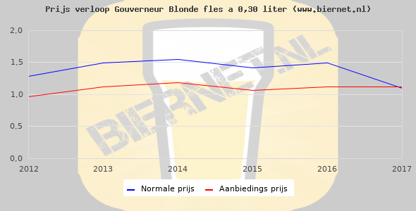 De gemiddelde prijs van een fles á 0,30 liter van Gouverneur Blond is €2,2 (€7,33 per liter). De gemiddelde prijs van Gouverneur Blond in de winkel is €9,10 per liter.