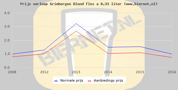 De gemiddelde prijs van een fles á 0,33 liter van Grimbergen Blond is niet bekend. De gemiddelde prijs van Grimbergen Blond in de winkel is niet bekend.