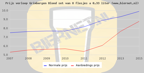 De gemiddelde prijs van een set van 8 flesjes á 0,33 liter van Grimbergen Blond is niet bekend. De gemiddelde prijs van Grimbergen Blond in de winkel is niet bekend.
