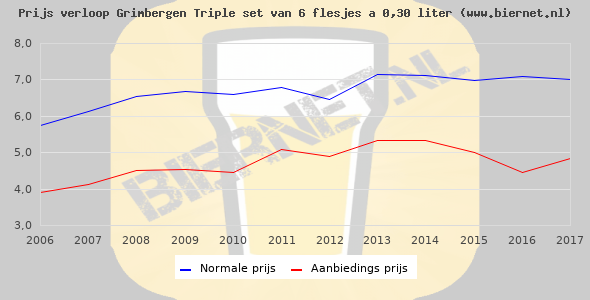 De gemiddelde prijs van een set van 6 flesjes á 0,30 liter van Grimbergen Tripel is €8,38 (€4,66 per liter). De gemiddelde prijs van Grimbergen Tripel in de winkel is €4,41 per liter.