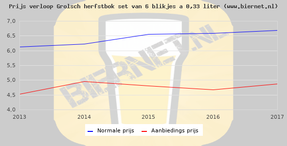 De gemiddelde prijs van een set van 6 blikjes 0,33 liter van Grolsch Herfstbok is €8,48 (€4,28 per liter). De gemiddelde prijs van Grolsch Herfstbok in de winkel is €4,12 per liter.