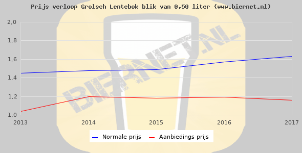 De gemiddelde prijs van een blik van 0,50 liter van Grolsch Lentebok is €2,23 (€4,46 per liter). De gemiddelde prijs van Grolsch Lentebok in de winkel is €4,27 per liter.