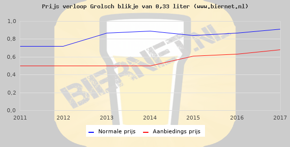 De gemiddelde prijs van een blikje van 0,33 liter van Grolsch Premium Pilsner is €9,37 (€28,39 per liter). De gemiddelde prijs van Grolsch Premium Pilsner in de winkel is €2,80 per liter.
