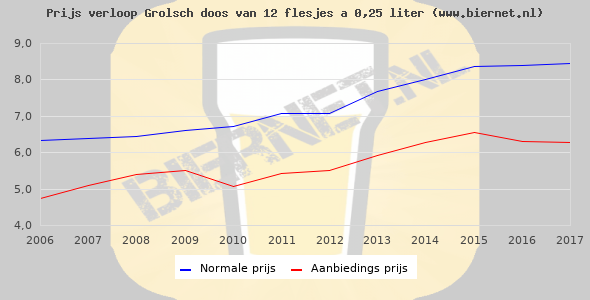 De gemiddelde prijs van een doos van 12 flesjes 0,25 liter van Grolsch Premium Pilsner is niet bekend. De gemiddelde prijs van Grolsch Premium Pilsner in de winkel is niet bekend.