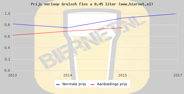 De gemiddelde prijs van een fles á 0,45 liter van Grolsch Premium Pilsner is €1,25 (€2,78 per liter). De gemiddelde prijs van Grolsch Premium Pilsner in de winkel is €2,80 per liter.