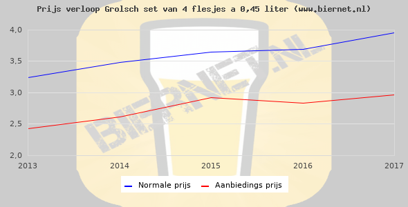De gemiddelde prijs van een set van 4 flesjes á 0,45 liter van Grolsch Premium Pilsner is €4,93 (€2,74 per liter). De gemiddelde prijs van Grolsch Premium Pilsner in de winkel is €2,80 per liter.