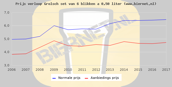 Hieronder staan de standaard prijzen van een Grolsch Premium Pilsner set van 6 blikken á 0,50 liter. Op dit moment zijn er 8 aanbiedingen van Grolsch Premium Pilsner.