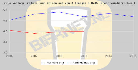 De gemiddelde prijs van een set van 4 flesjes á 0,45 liter van Grolsch Puur Weizen is niet bekend. De gemiddelde prijs van Grolsch Puur Weizen in de winkel is niet bekend.