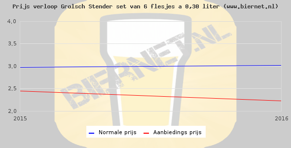 De gemiddelde prijs van een set van 6 flesjes á 0,30 liter van Grolsch Stender is niet bekend. De gemiddelde prijs van Grolsch Stender in de winkel is niet bekend.