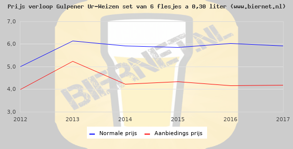 De gemiddelde prijs van een set van 6 flesjes á 0,30 liter van Gulpener Biologisch Weizen is €9,32 (€5,18 per liter). De gemiddelde prijs van Gulpener Biologisch Weizen in de winkel is €4,69 per liter.