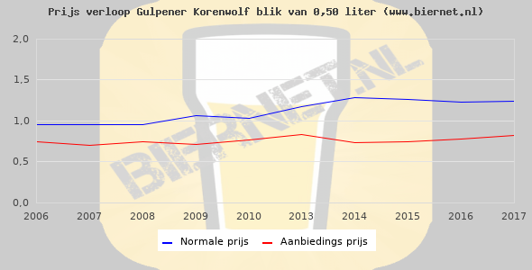 De gemiddelde prijs van een blik van 0,50 liter van Gulpener Korenwolf is niet bekend. De gemiddelde prijs van Gulpener Korenwolf in de winkel is niet bekend.