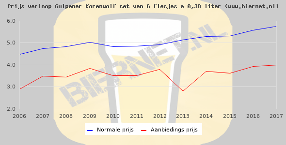 De gemiddelde prijs van een set van 6 flesjes á 0,30 liter van Gulpener Korenwolf is niet bekend. De gemiddelde prijs van Gulpener Korenwolf in de winkel is niet bekend.
